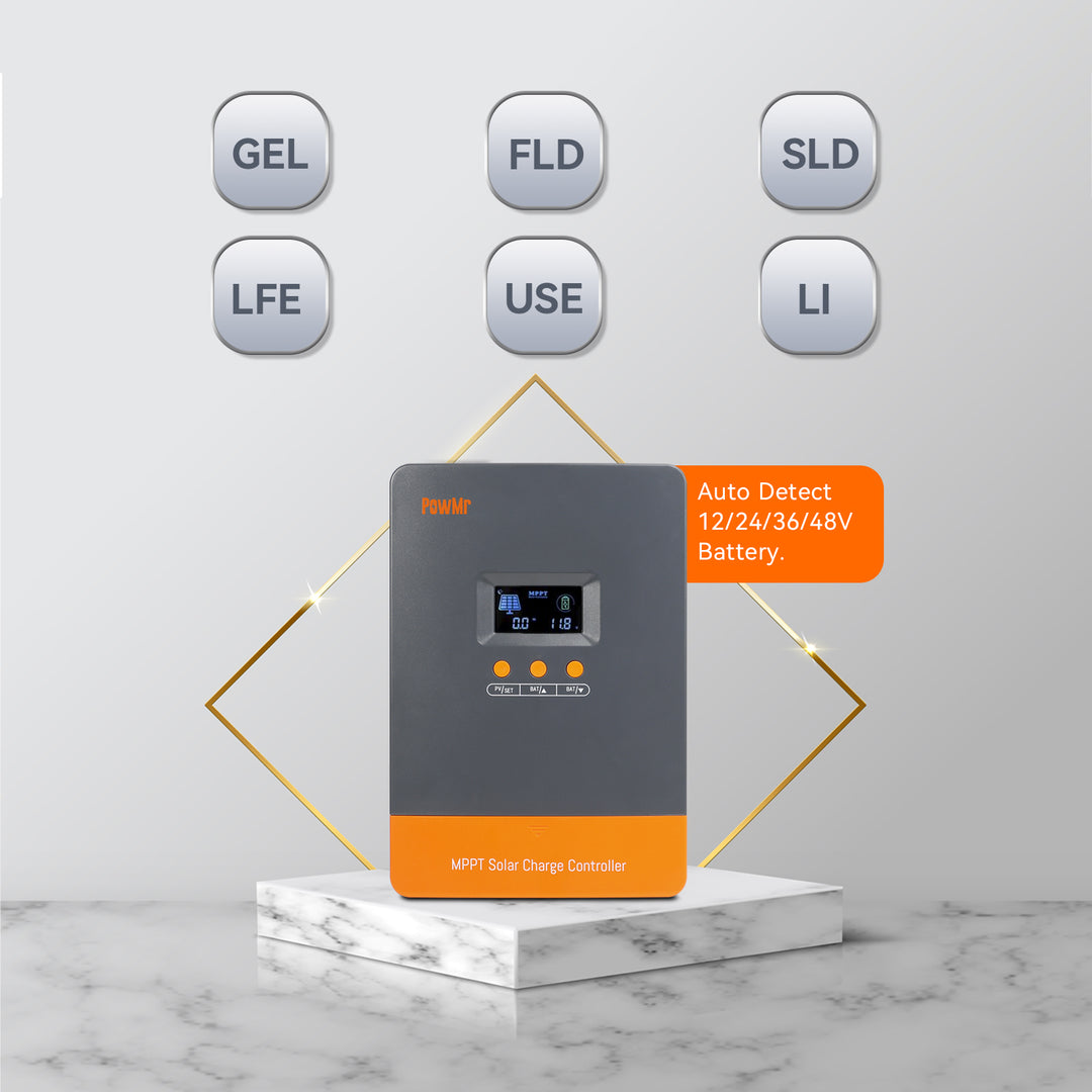 The built-in DSP controller, coupled with high-performance capabilities, automatically detects 12V, 24V, 36V, and 48V solar battery voltages. It offers compatibility with a wide range of Deep Cycle battery options, including Lithium, LiFePO4, Li(NiCoMn)O2, Flooded, Sealed, Gel, and User-Defined batteries.