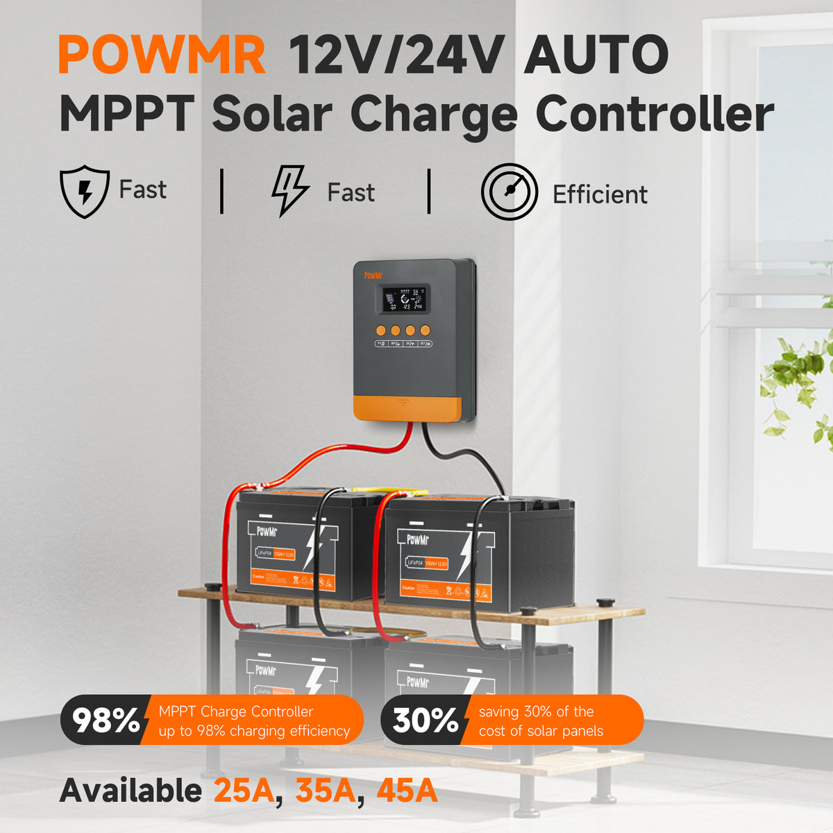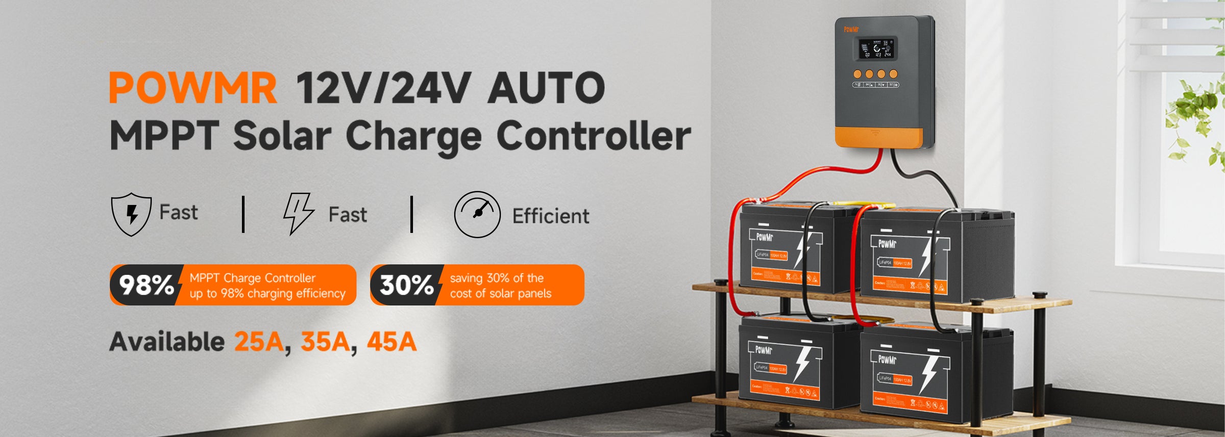 45A solar charger featuring MPPT technology with up to 99% tracking efficiency and 98% peak conversion efficiency, delivering optimized charging for RVs, boats, cabins, and other off-grid applications.