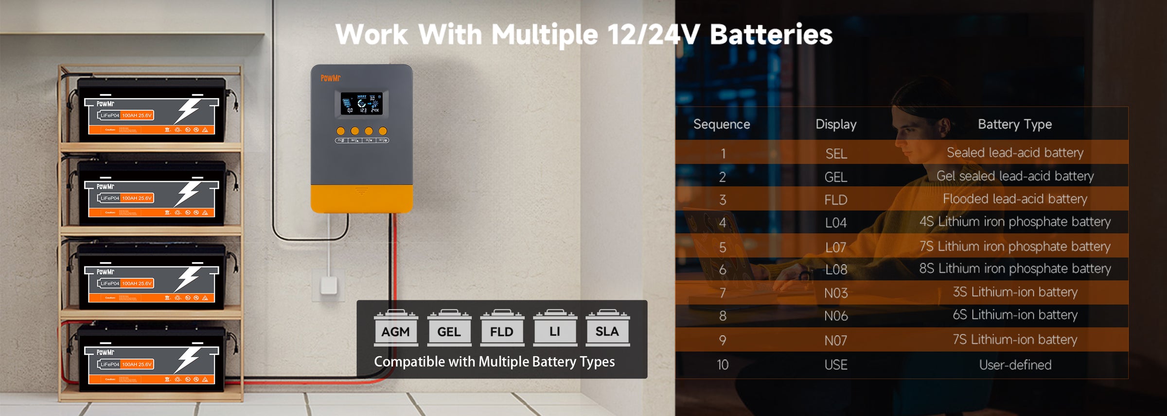 Supports a wide range of batteries including flooded lead-acid, sealed gel, lithium-ion, LiFePO4, and user-defined types, ensuring versatile and reliable operation in diverse off-grid applications.