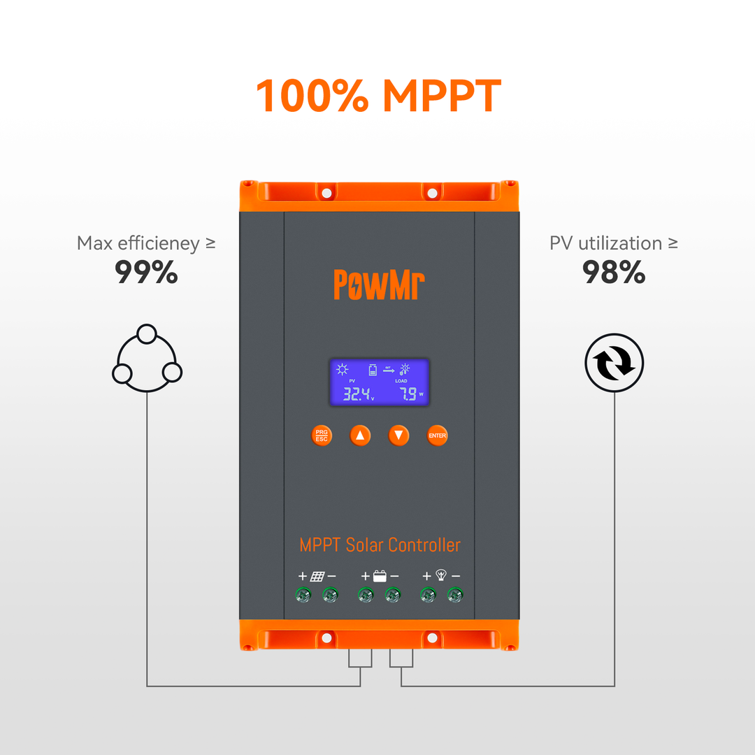 Innovative MPPT technology with a tracking efficiency of up to 99.9% and a peak conversion efficiency of up to 98%, reducing power consumption, minimizing heat generation, and lowering operating temperatures. MPPT technology tracks the maximum power point voltage (Vmp) of the array as it varies with weather conditions, ensuring the collection of maximum power from the array throughout the day.