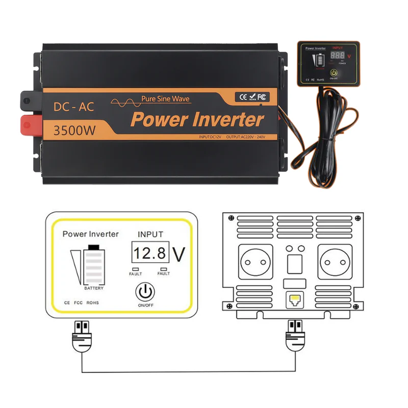 Provides true rate pure sine 3500w continuous power, converts 12V dc battery power to standard 220V ac, high conversion efficiency (>90%), ,advanced pure sine wave technology provides quality AC equivalent to grid power, chip controls the output and keeps constant, ensure that the inverter outputs stably without damaging the load.